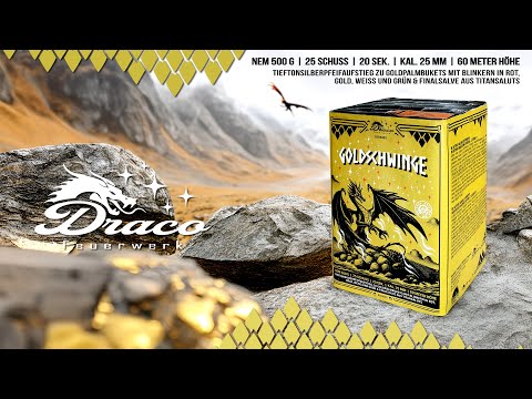 Tieftonsilberpfeifaufstieg zu Goldbukets mit Blinkern in Rot, Gold, Weiss und Grün sowie Finalsalve aus Titansaluts.