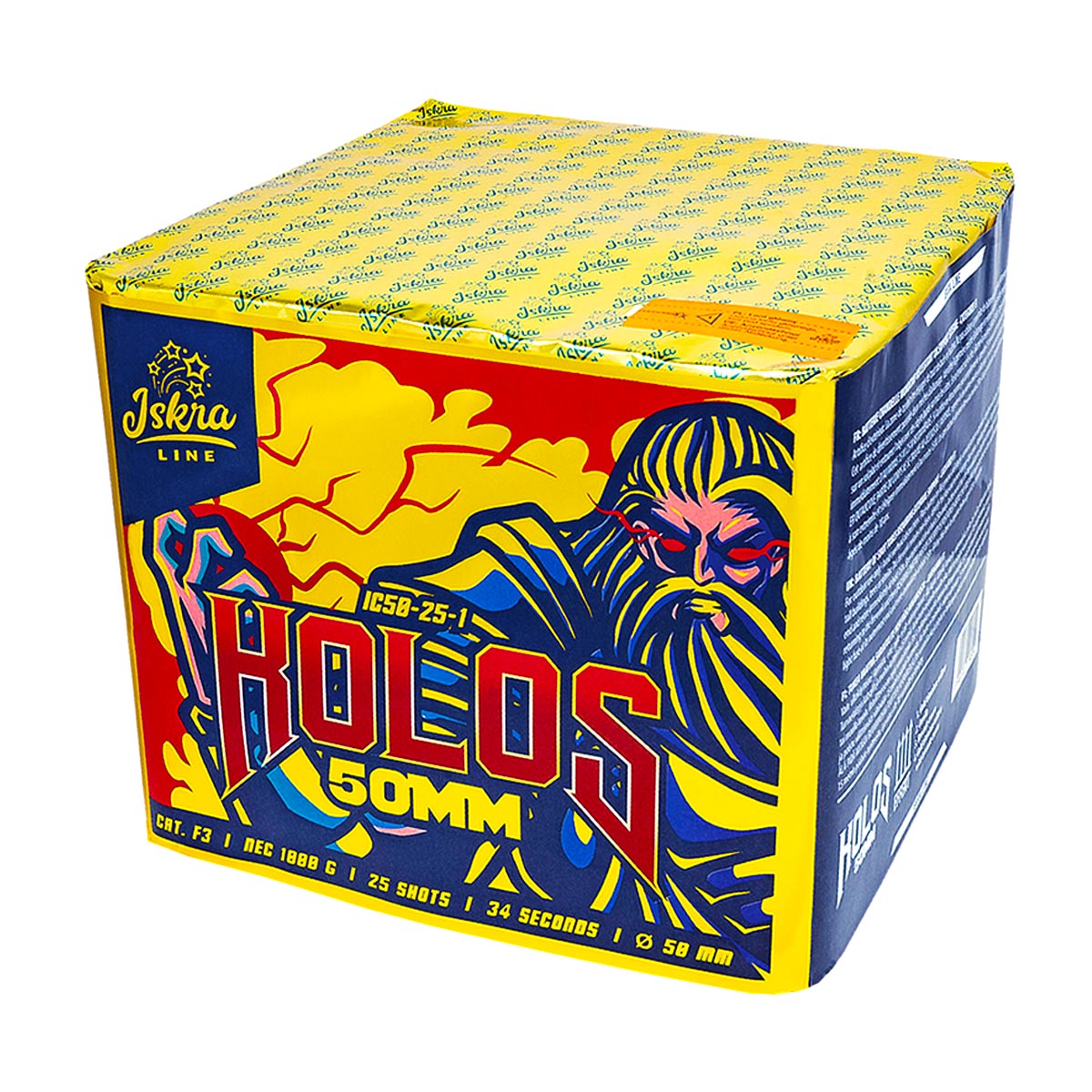 Fette 50mm Batterie Kolos aus der ISKRA Linie von Funke Feuerwerk mit folgenden Effekten: Gold-Titan-Weide, Corolla-Goldweide, Brokatkrone.