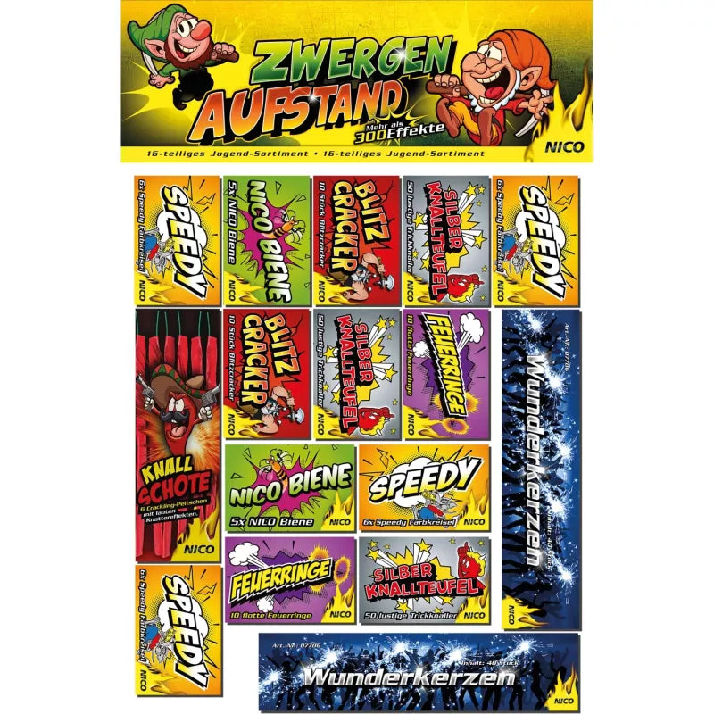 Inhalt : 4x Speedy, 2x Nico Biene, 2x Blitz Cracker, 3x Knallteufel, 2x Feuerring, 1x Knallschote, 2x Wunderkerzen