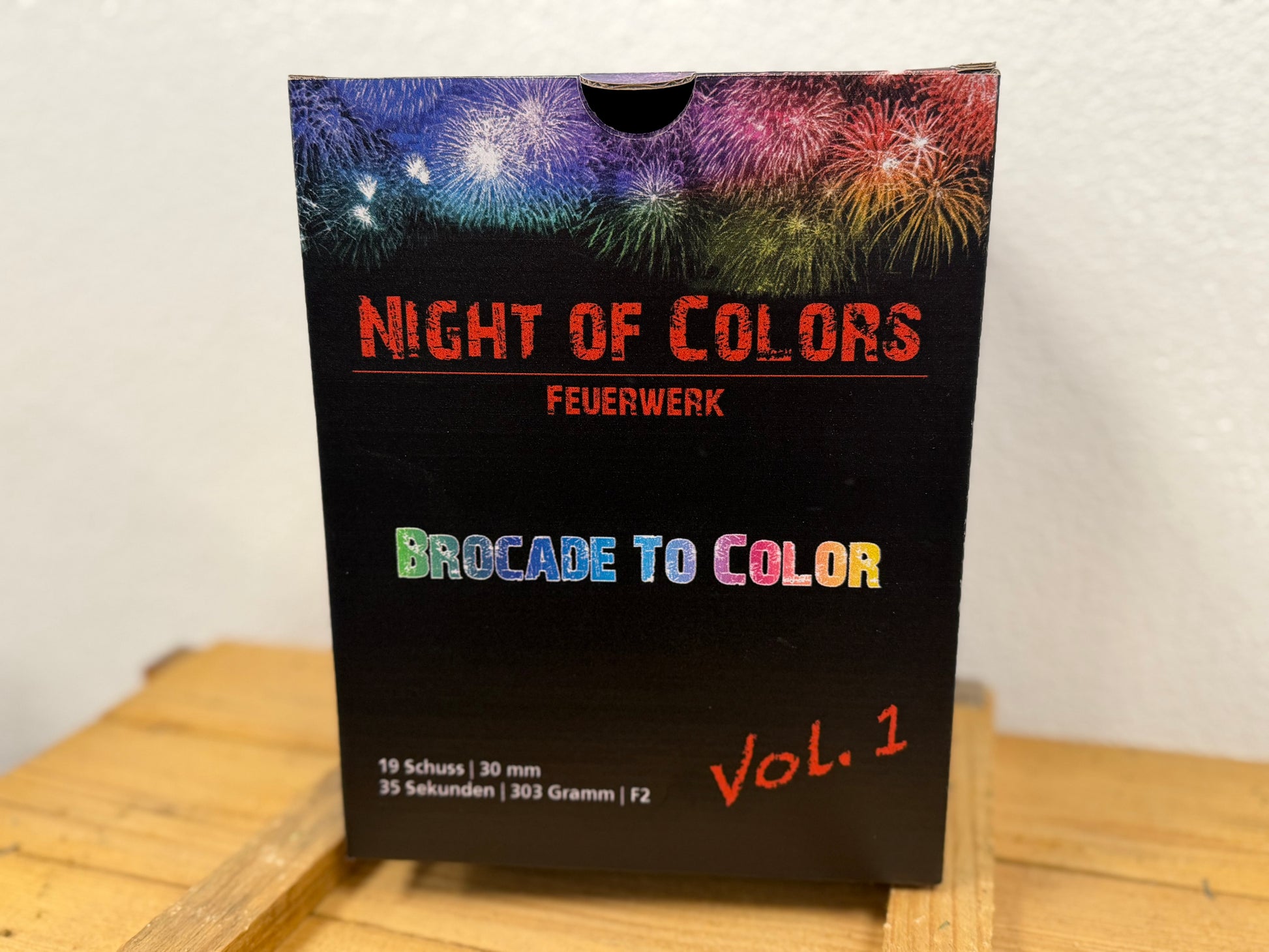 Ein kraftvoller Einzelabschuss im I-Shape mit markanter Zerlegung: Zunächst entfaltet sich eine majestätische Brocade-Krone aus goldenen Verästelungen, die sich langsam und breit am Himmel ausbreitet. Im zweiten Moment mischen sich kräftige Farbsterne in Rot, Blau und Grün in das goldene Geflecht und sorgen für farbige Akzente mit starker Leuchtkraft. Die Kombination aus klassischer Brokatstruktur und modernen Farbkomponenten erzeugt einen harmonischen, zugleich dynamischen Effekt – edel, eindrucksvoll und vielseitig einsetzbar.